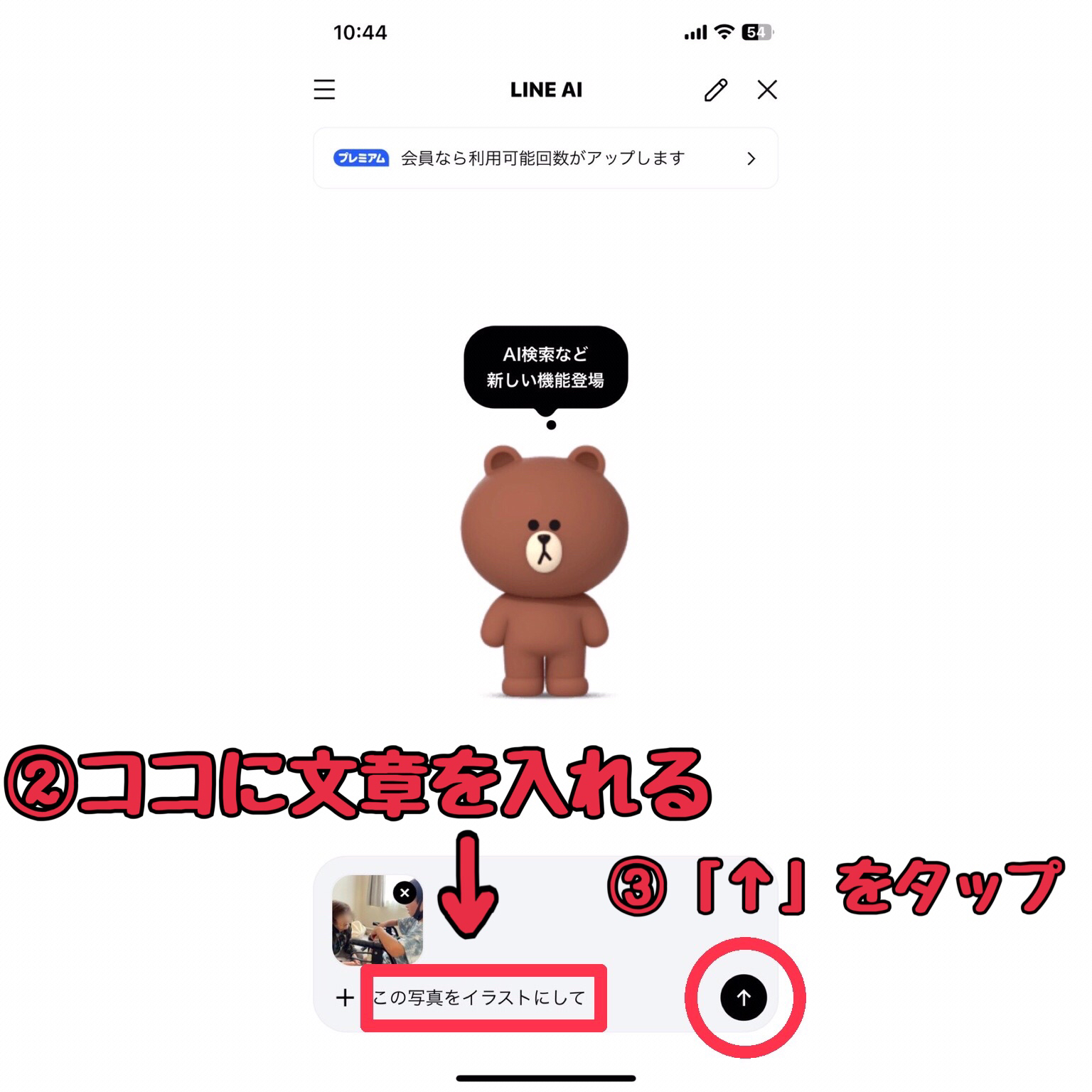 ②添付した写真の下に「この写真をイラストにして」と打ち、「↑」マークをタップします。