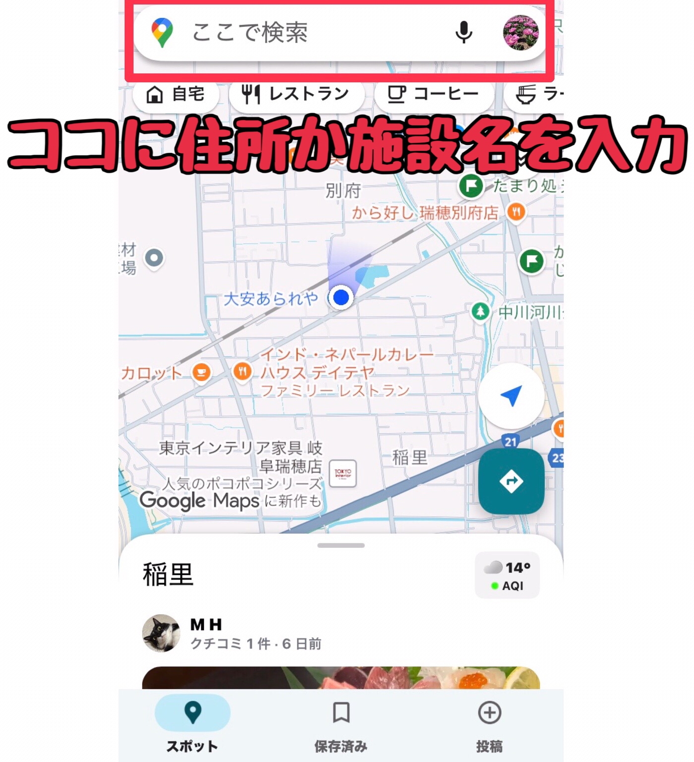 ①Googleマップの「ここで検索」の欄をタップし、見てみたい場所の住所か施設名を入力する。